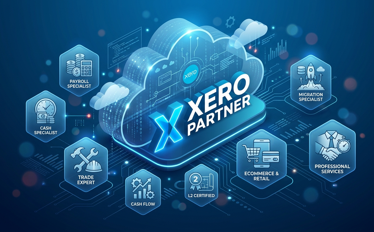 Our team holds a variety of Xero badges, including L1 and L2 certifications, Payroll Specialist, Migration Specialist, Cash Flow Specialist, and industry-specific badges like Trade Expert and Ecommerce & Retail Expert.
